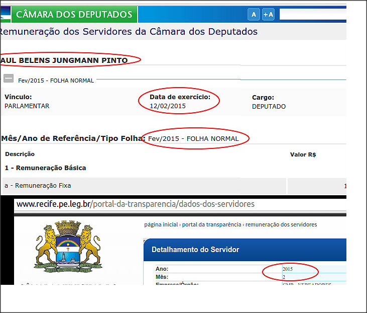 Continua errado. Como o deputado começou a receber em Brasília a partir de 12 de fevereiro, como comprova o portal da transparência da Câmara dos Deputados, só pode ser remunerado pela Câmara do Recife até o dia 11, pois é proibido acumular os dois cargos. Se receber até o dia 20 de fevereiro, como informou a assessoria, continua na situação de vereador “fantasma” na folha de pagamento por nove dias.