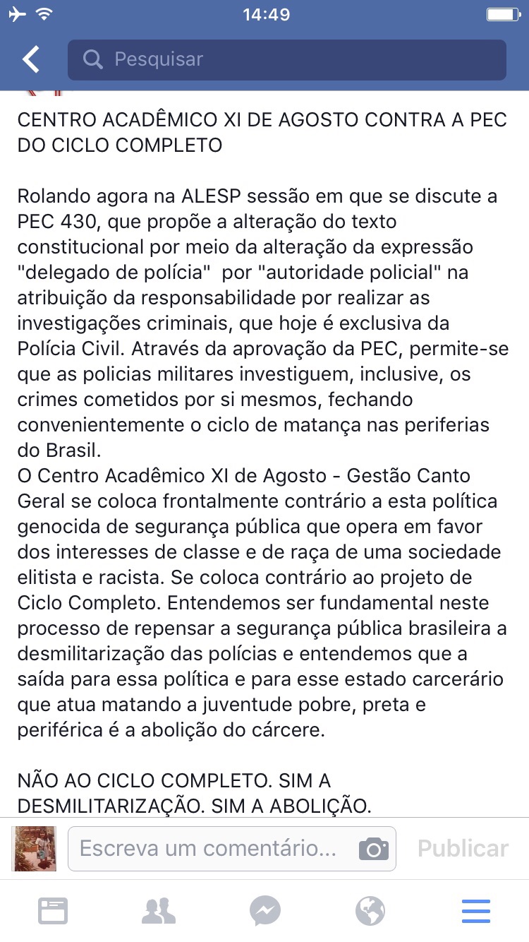 Quinhentas viaturas que poderiam estar patrulhando, evitando o crime acontecer, e estavam onde? Dentro da ALESP, pressionando por um projeto de projeto de projeto. A PEC 430, assim como as outras seis apensadas a ela, está em fase pré-embrionária, ou seja, acabaram de ser fecundadas e sequer se tronaram embriões, dada a falta de um estudo coerente, de uma auditoria nas polícias, de características do funcionamento do ciclo e, fundamentalmente, da consulta popular, ou seja, falta quase tudo, e já estão querendo colocar uma farda nesse embrião, antes sequer que ele tenha uma identidade, antes que nasça, e querem coloca-lo para fazer policiamento nas ruas. AS POLÍCIAS NÃO FUNCIONAM PELAS MESMAS RAZÕES QUE FORAM CRIADAS. PELA FALHA DO ESTADO EM PROVER AS NECESSIDADES DO POVO.