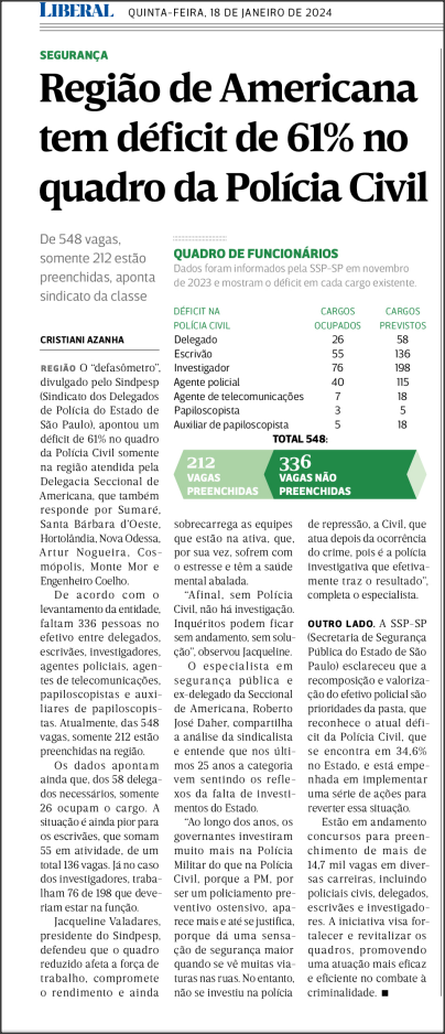 O “defasômetro”, divulgado pelo Sindpesp (Sindicato dos Delegados de Polícia do Estado de São Paulo), apontou um déficit de 61% no quadro da Polícia Civil somente na região atendida pela Delegacia Seccional de Americana, que também responde por Sumaré, Santa Bárbara d’Oeste, Hortolândia, Nova Odessa, Artur Nogueira, Cosmópolis, Monte Mor e Engenheiro Coelho.